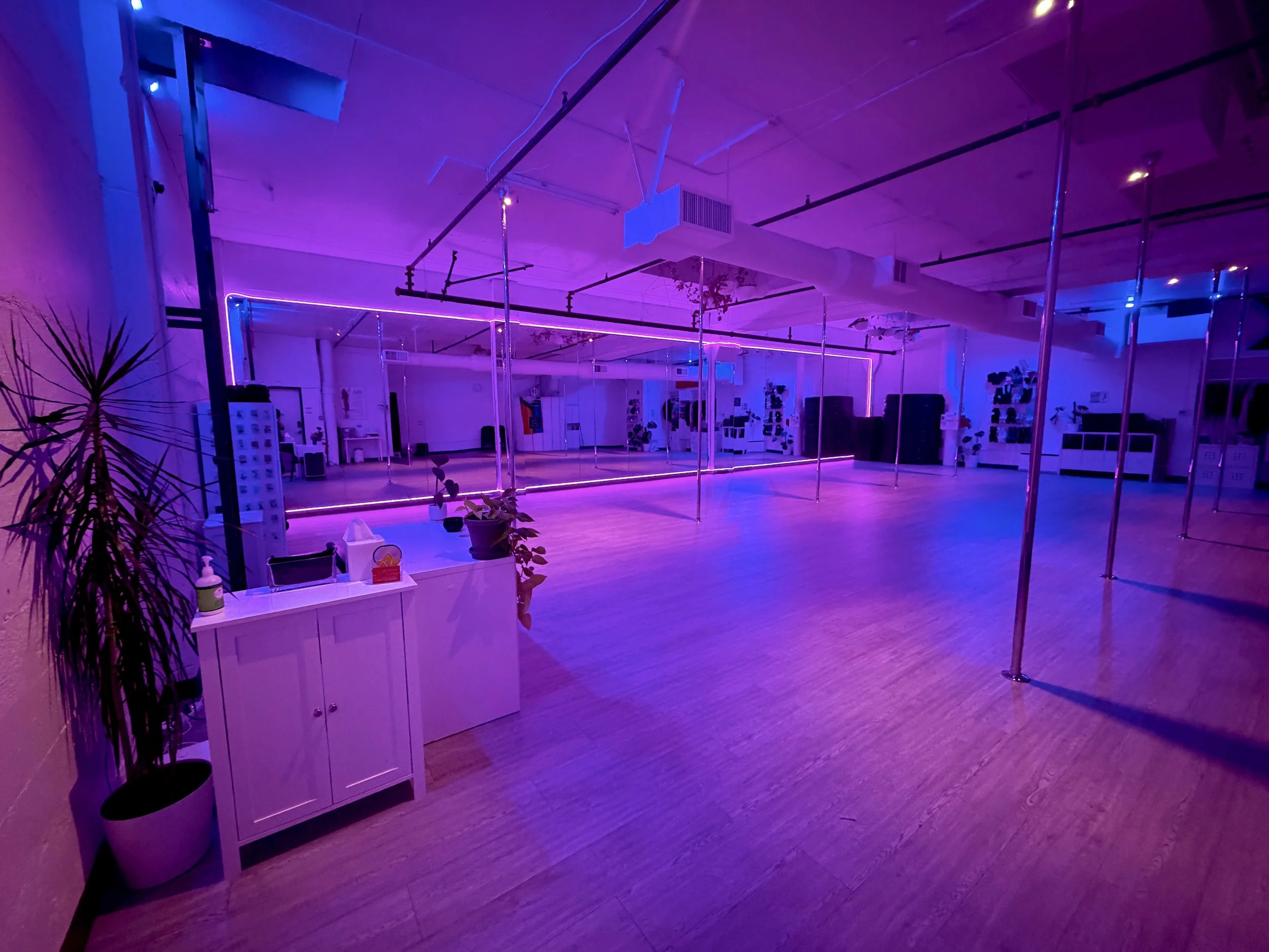 At the end of a brick hallway and up a short flight of stairs, open the door to a gorgeous, welcoming, light-filled movement space dripping in plants. High ceilings and extra space between poles means you’ll want to dance your heart out anytime, day or night.